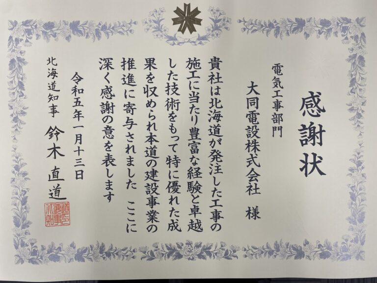 1/13(金)にホテルポールスター札幌で行われた2022年度建設部工事等優秀者表彰について、「北海道立室蘭高等技術専門学院管理棟改修電気設備工事」に関して感謝状を頂きました。