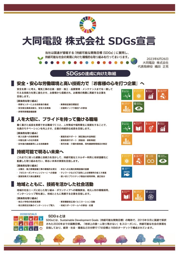 弊社では、持続可能な社会の実現を目指し、SDGsの精神を企業活動として取り組む事と致しました。企業としてより一層成長していけるよう、社員一丸となりSDGsの目標に向けて取り組んで参ります。