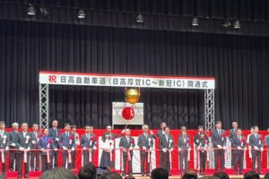 日高自動車道開通式 2026年3月13日 2026年2月28日 日高自動車道「日高厚賀IC~新冠IC」の開通式が新冠町のレ・コード館 町民ホールで開催されました。 当社は2022年より大狩部トンネルの「照明設備」「非常警報設備」 「受変電設備」および厚賀静内道路電気設備工事を担当しました。 これらの工事に携わったことから開通式にご招待いただき 織田代表取締役が式典に出席いたしました。 日高自動車道の開通により、地域の交通利便性の向上と災害時の 緊急輸送ルートの強化など、さらなる発展が期待されます。